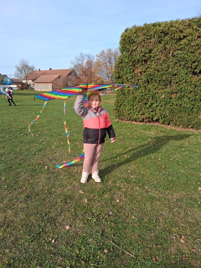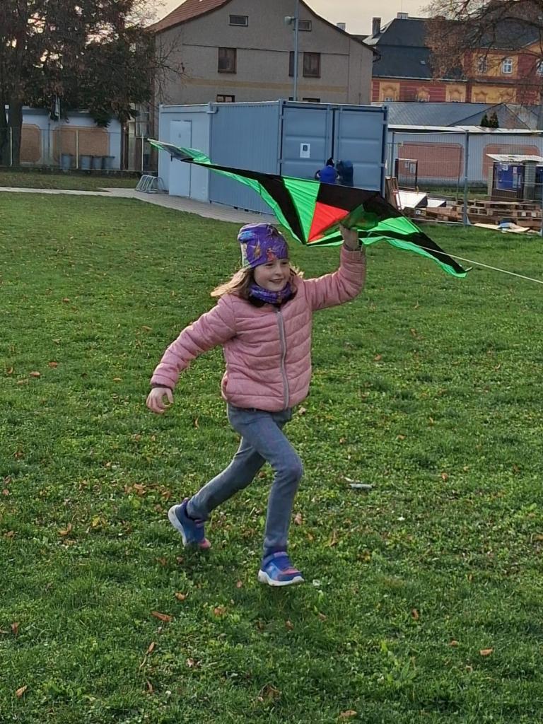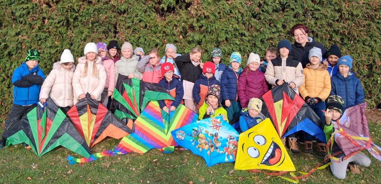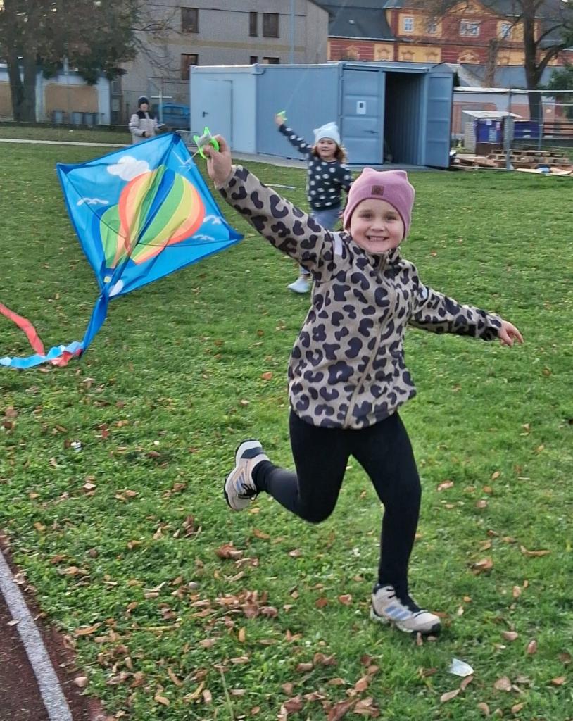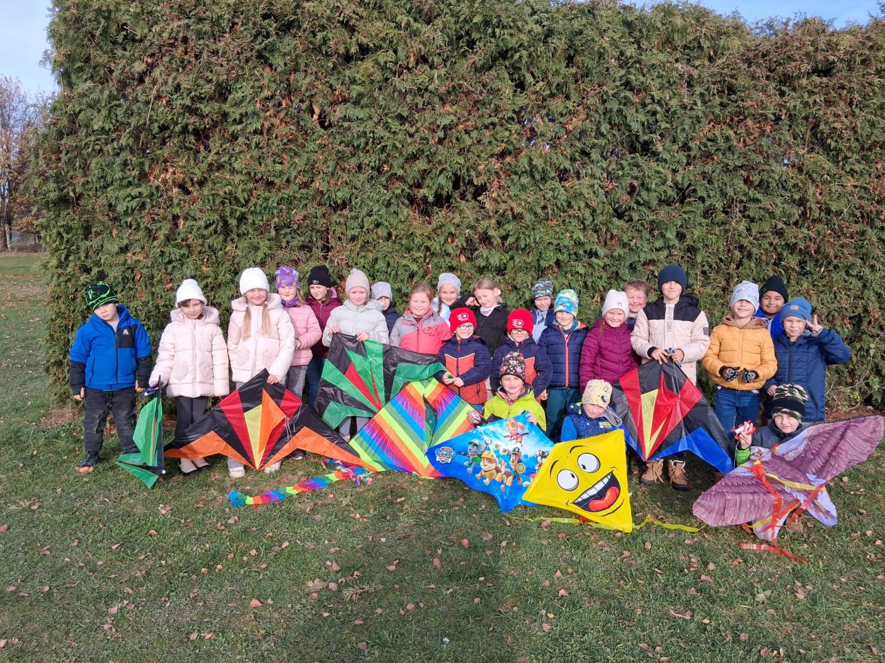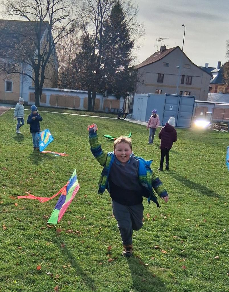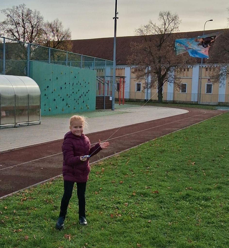 Dnes odpoledne žáci z družiny pouštěli draky na dětském hřišti. Pod dohledem paní vychovatelky se jim dařilo rozběhnout a dostat draky vysoko do vzduchu. Barevné ocásky se třepotaly ve větru a hřiště bylo plné smíchu a nadšení. I když se občas nějaký drak zamotal, všichni si odpoledne užili.