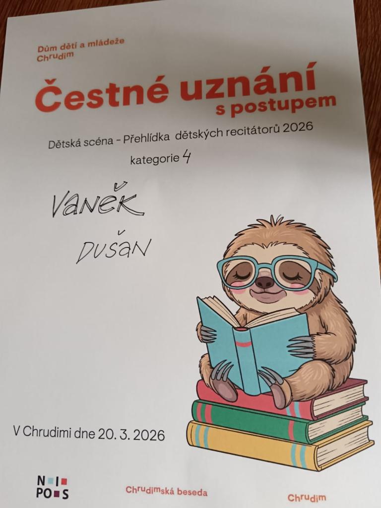 20. 3. se okresního kola recitační soutěže účastnili i nejlepší žáci z druhého stupně. A právě tady musíme vzdát holt vítězi nad všemi. Máme nejlepšího recitátora z celého Chrudimska. Je jím Dušan Vaněk s postupem do krajského kola. Čest naší škole zcela jistě prokázal i Joseph Sundt. Moc gratulujeme.